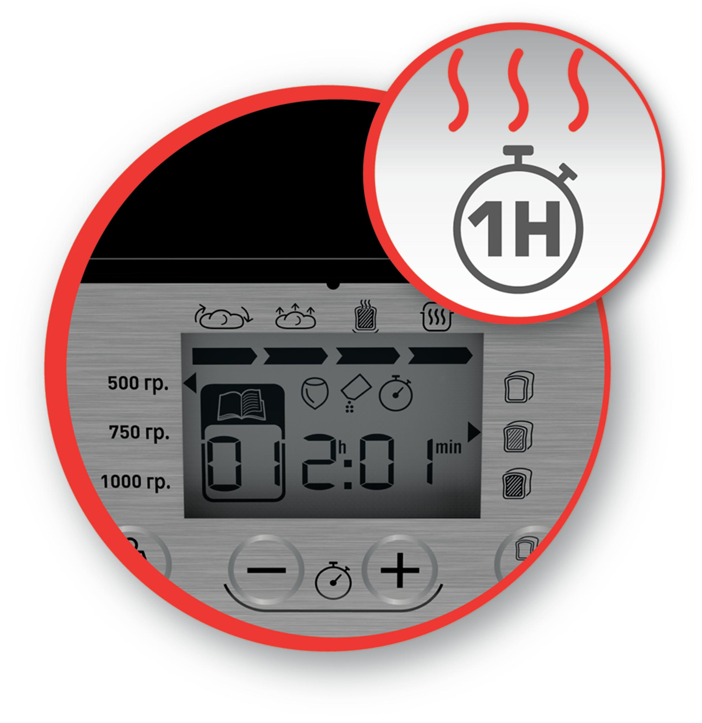Functions for programmable start up to 15 hours and keep warm for 1 hour offer you more comfort and the possibility to serve freshly baked bread every morning.