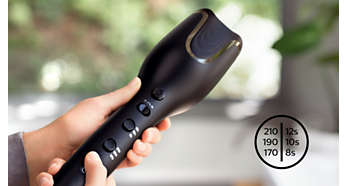 Cele 3 setari de temperatura (170 °C - 190 °C - 210 °C) si cele 3 setari de timp (12 s - 10 s - 8 s) te ajuta sa obtii rezultate excelente, de la bucle lejere pana la bucle bine definite, pe diferite tipuri de par. De exemplu, setarea de temperatura ridicata cu durata suplimentara pentru ondulare iti va modela buclele mai strans – ideala pentru parul mai des. Setarea de temperatura scazuta cu durata mai scurta de ondulare este optima pentru parul care necesita protectie suplimentara.