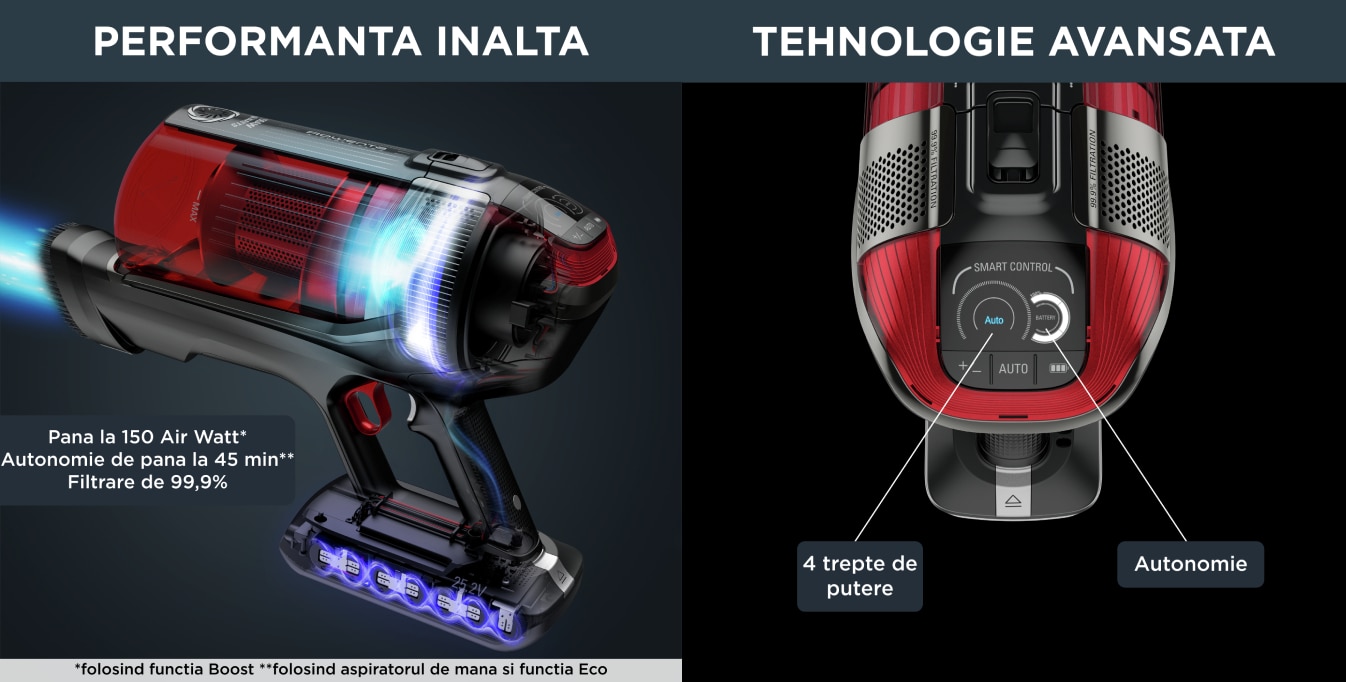 Un aspirator de exceptie: putere de aspirare de pana la 150 Air Watts (in mod boost), autonomie pana la 45 minute (folosind aspiratorul de mana in mod Eco), filtrare avansata de pana 99.9% a prafului si alergenilor.