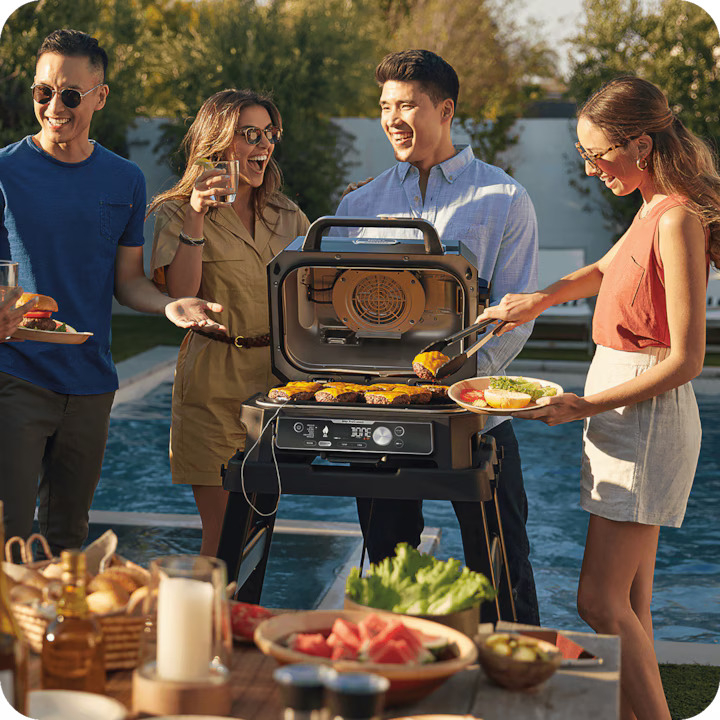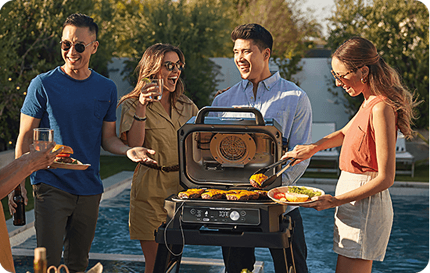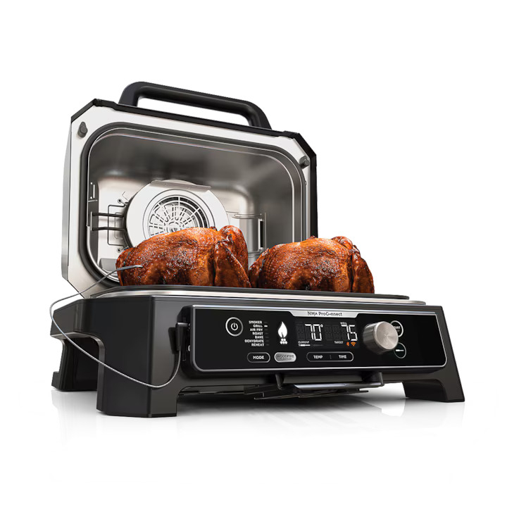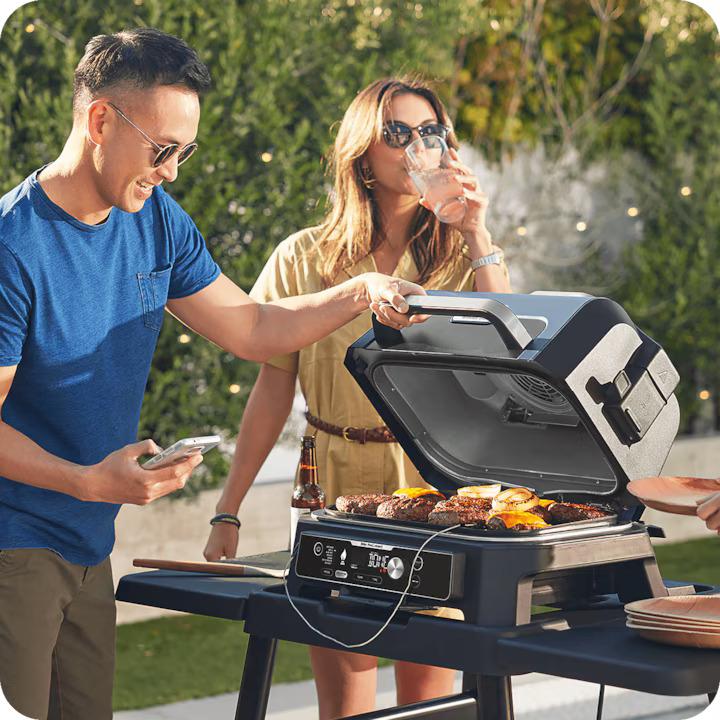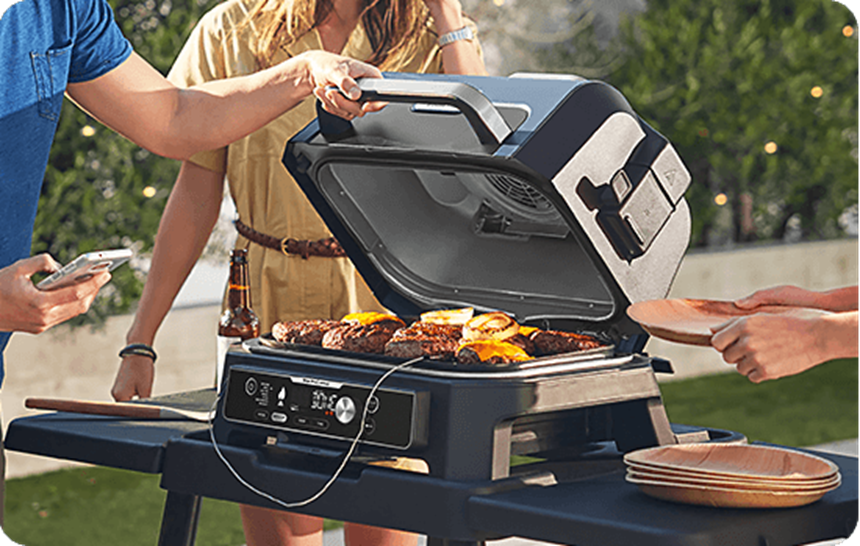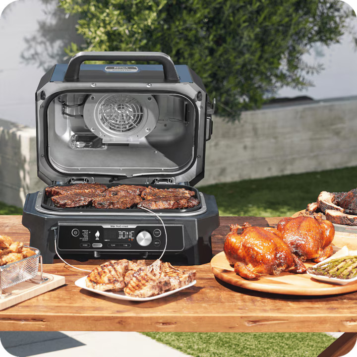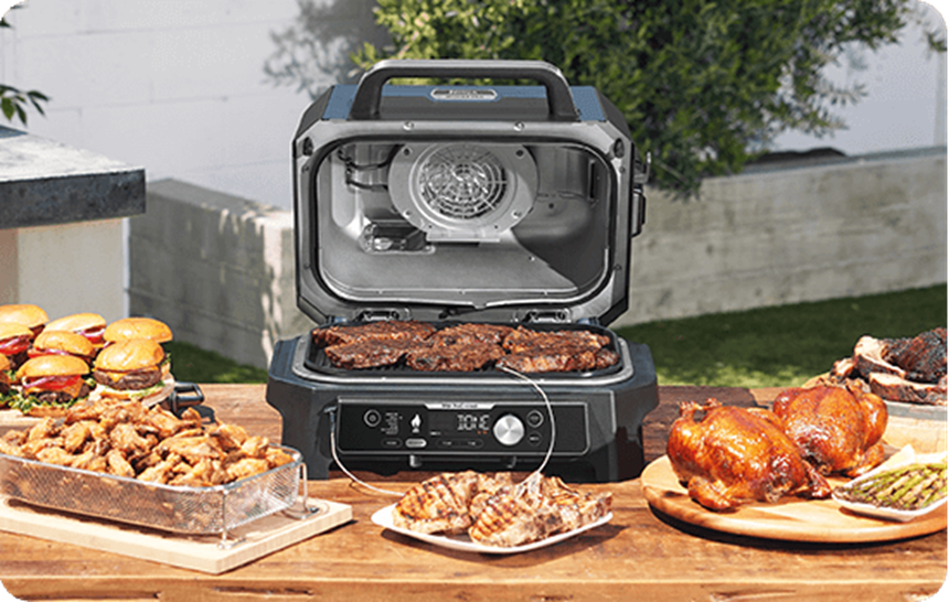 Descopera o noua modalitate de a gati in aer liber cu gratarul electric Ninja Woodfire Pro Connect: gratar, afumare, prajire fara ulei si multe altele.