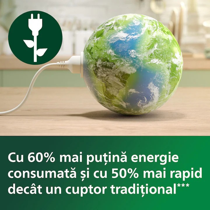Performanta dovedita. Prepara cartofi prajiti la fel de crocanti ca cei preparati intr-o friteuza adanca traditionala, dar care contin cu pana la 90 % mai putina grasime. Prajeste un pui intreg cu piele crocanta si carne frageda, eliminand in acelasi timp grasimea.