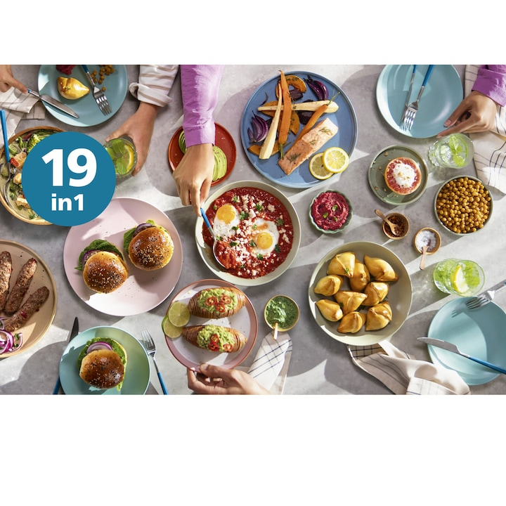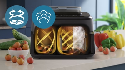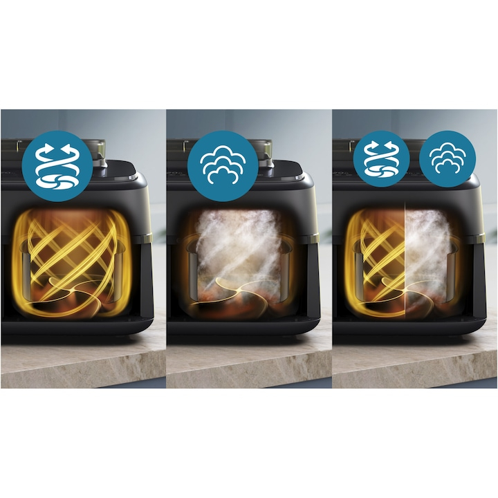 Airfryer de 9 l cu 2 cosuri si functie de preparare la abur: un cos de 6 l pentru felurile principale, cartofi prajiti si alimentele preferate si un sertar de 3 l pentru garnituri si gustari. Are o capacitate pentru pana la 1100 g de cartofi prajiti, 1600 g de legume sau 12 ciocanele de pui. In cosul mare incape si un pui intreg de 1,2 kg
