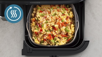 Cina de ieri la pranz? Absolut. Functia de reincalzire foloseste aburul pentru a pastra umiditatea, fiind perfecta pentru reincalzirea mancarurilor, cum ar fi orezul sau lasagna, care se usuca in aparatele Airfryer traditionale sau in cuptoarele cu microunde.
