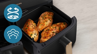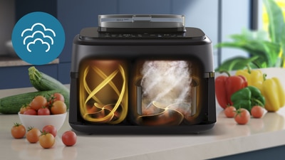 90% dintre consumatori sunt multumiti de gust. Obtine fragezimea oferita de prepararea cu abur si textura crocanta oferita de prajirea cu aer fierbinte folosind tehnologia RapidAir cu Air Steam