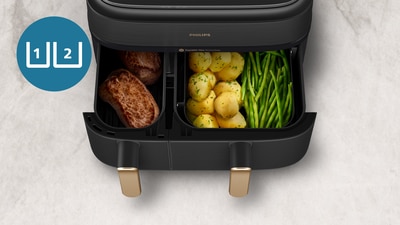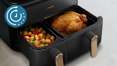 Sincronizeaza automat duratele de preparare in cele 2 cosuri pentru a avea alimentele preparate in acelasi timp