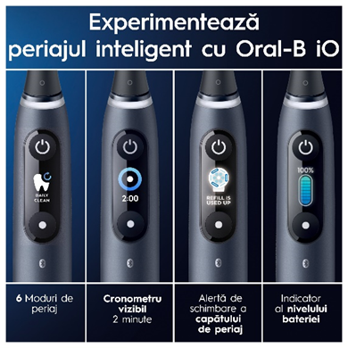 Periuta electrica Oral-B iO8 ofera o curatare profesionala acasa, cu tehnologie magnetica iO, 6 moduri de periaj, ecran interactiv si senzor de presiune inteligent pentru ingrijire personalizata a danturii.